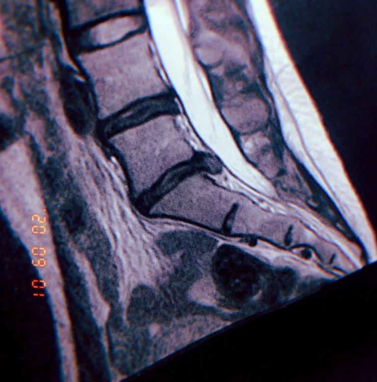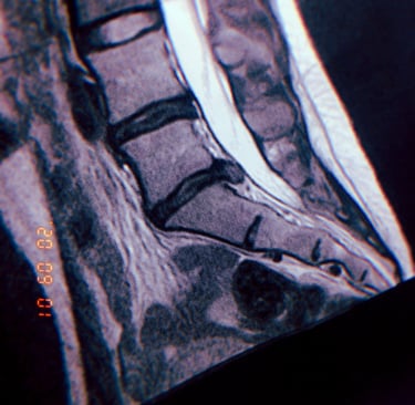 < MRI scan showing a herniated disc, a common ailment affecting individuals in the riding industry.